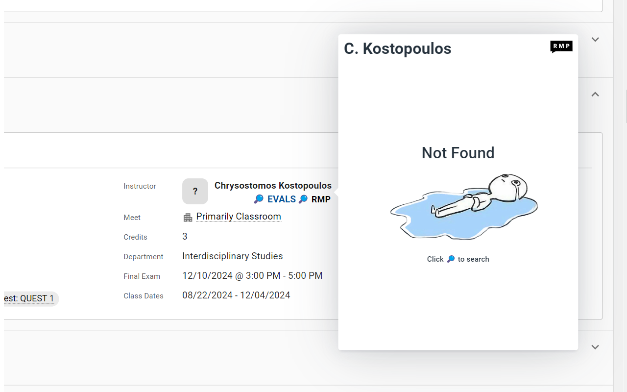 If a professor isn’t listed on RateMyProfessors, you’ll see a clear “Not Found” message and a prompt to search manually on RMP.