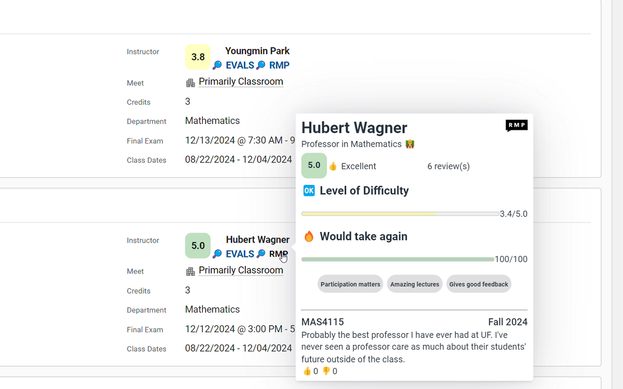 View a professor’s overall rating, difficulty bar, “would take again” percent and top student comments—all without leaving ONE.UF.