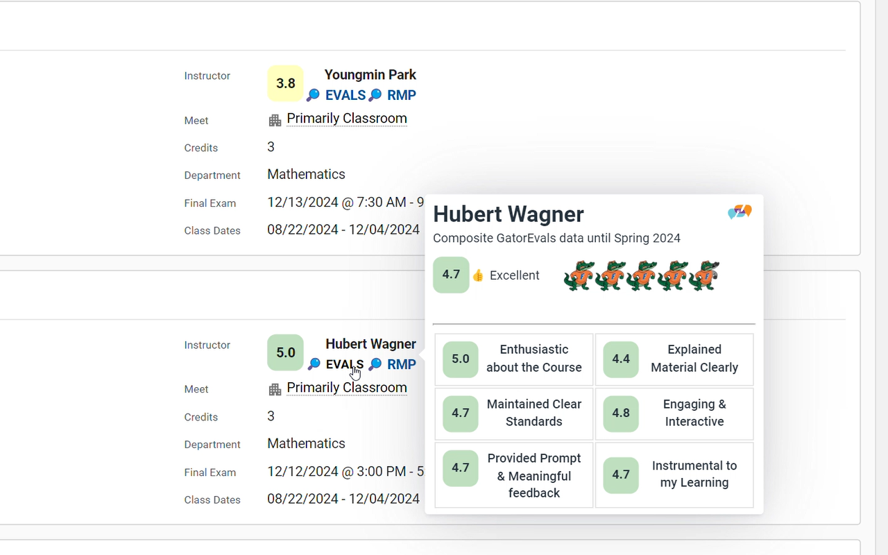 Get UF’s in-house course evaluations: composite scores, detailed sub-ratings, and term-by-term breakdowns.